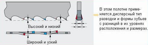 дисперный тип разводки и формы зубьев позволяет уменьшить сопротивление резанию